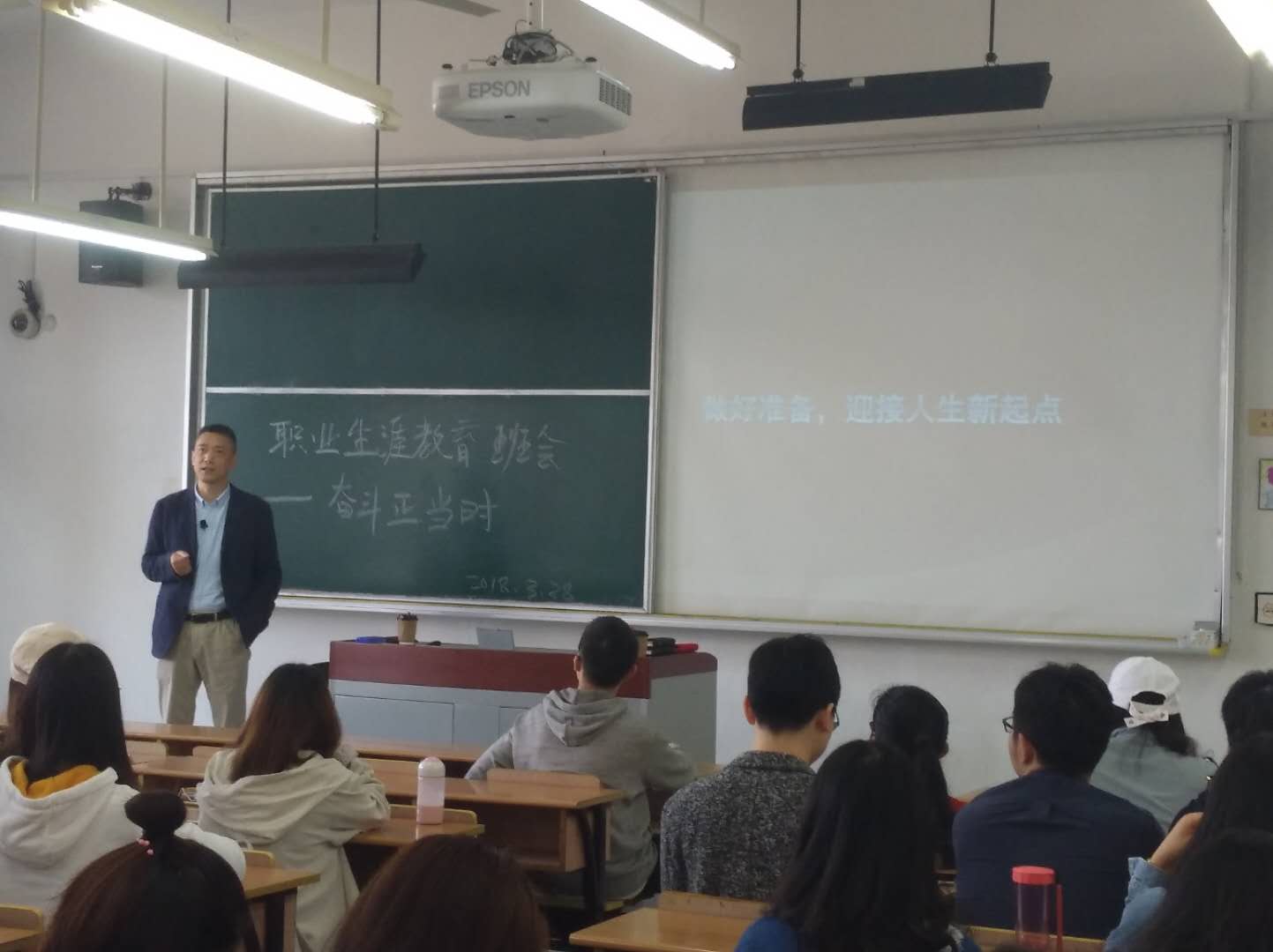 谈到同学们的未来规划,徐老师希望同学们根据自身情况尽快慎重决定毕业后去向。对于选择读研的同学,徐老师敦促他们仔细了解心仪院校的招生简章及相关条件,明确自己的目标。其中争取保研的同学尤其应当注意关注各校承办的夏令营活动,有效利用时间,抓紧准备资料。而对于有意愿出国的同学,徐老师建议他们可向有游学、访学经历的同学们多多了解申请过程中相关信息;若同学们确定了毕业后的方向是直接参加工作,徐老师给的建议是趁本年秋招之前,利用空余时间做一些与专业对口、与自己未来求职意向相符的实习。珍惜时间,不浪费每一个实习的机会。需要注意的是,实习的单位或企业最好能够选择实力强一些的,这样能让大家在实习中更好提高自己的工作能力,开拓自己的专业视野。 此外,徐老师还强调了一些之前提到过的常用事项,如:成绩核对与学分认定的处理、各类学校事务申请表的下载方法、退选课及成绩单打印等事项的咨询和处理。 讲解完以上事项后,徐老师进行了简短的总结。接着由辅导员丁伟老师向大家简要介绍并欢迎中国电信上海公司人力资源部的骆巍先生给大家做职业规划方面的指导。