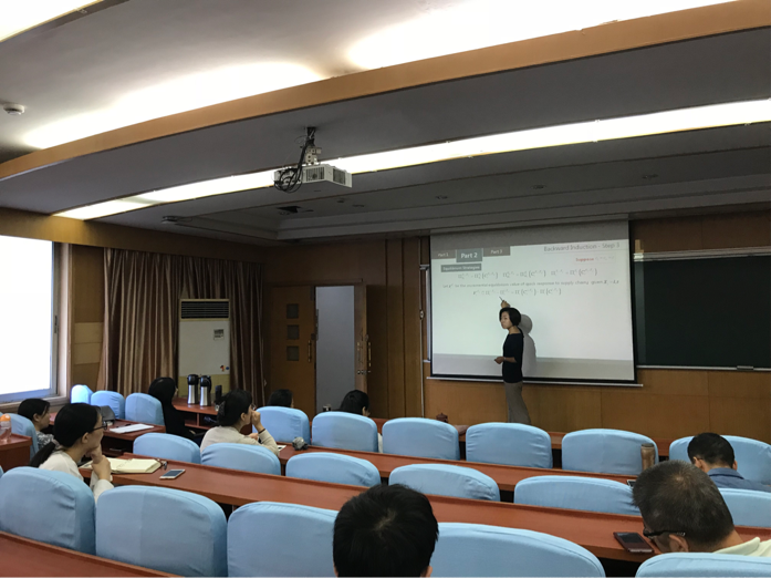 第一个报告主题是 “Quick response strategy of supply chains under horizontal competition”。周建亨教授阐述了“快速响应在水平供应链环境下的影响”,并对快速响应模式和效率响应模式在信息不确定的环境下进行了全面的比较。为师生们对于“quick response”和“efficient response”这两种不同响应模式的思考开拓了新视野和新思路。