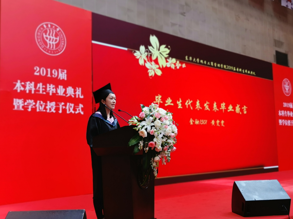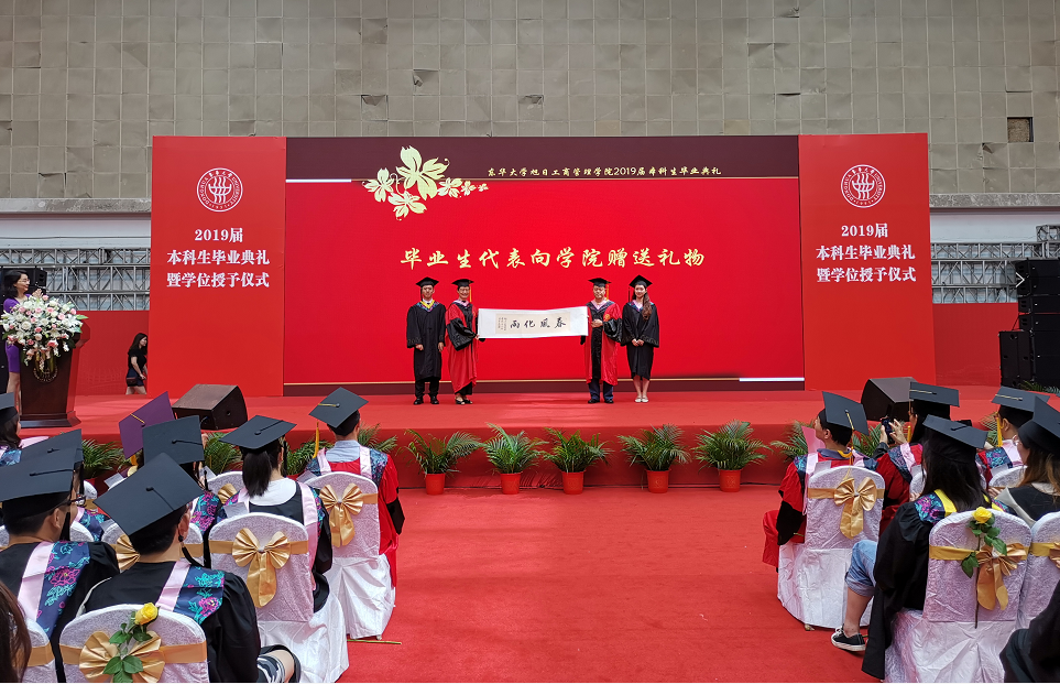 在毕业生代表发言环节,2019届毕业生代表黄雯雯带领同学们一起回顾了大学四年的成长轨迹。黄雯雯同学深刻感受到,“崇德博学、砺志尚实”的校训时时刻刻鞭策着每一位东华学子爱校荣校、崇尚学术、追求卓越、敬业奉献。“严谨、勤奋、求实、创新”彰显着东华人的精神面貌。四年间,她收获了青春最美的回忆,收获了亲密无间的友谊,拥有了强烈的责任感,培养了勇敢追梦的自信,也学会了对生活充满感激。最后,她满含深情地感恩母校的悉心培育与老师们无微不至的呵护关怀,也祝愿所有毕业生们前程似锦,祝愿母校枝繁叶茂。发言结束后,毕业生代表徐智坤同学向91直播赠送了礼物。