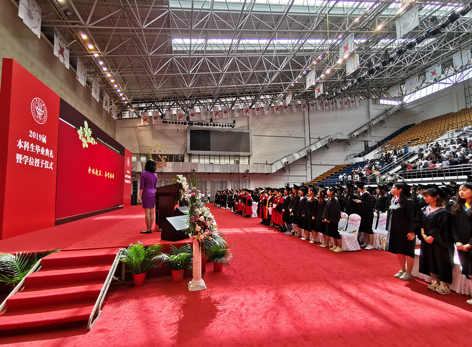 2019年6月25日上午,91直播 91直播 2019届本科生毕业典礼暨学位授予仪式在延安路校区体育馆隆重举行。91直播 党委副书记崔运花、91直播 党委书记林文伟副教授、91直播 院长徐寅峰教授、91直播 副院长郑斐峰教授、91直播 党委副书记丁怡副教授、91直播 各系主任及部分教师代表出席毕业典礼。607名2019届毕业生和家长代表共同见证了这庄严的时刻。 当天上午9:00,毕业生们在毕业留言版处签名,然后踏着毕业红毯,怀着激动兴奋,又眷恋不舍的心情进入体育馆。 此次毕业典礼由91直播 党委副书记丁怡主持。典礼在庄严的国歌声中拉开帷幕。